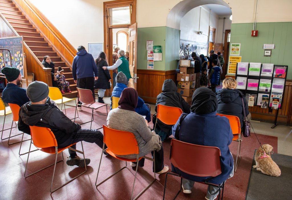 Mellissa Grazier sat inside at a table waiting for her number to be called Tuesday while volunteers moved busily around her calling numbers, retrieving items and helping clients. A disk in her back pressing on her spine makes it difficult for her to stand for long periods of time and she relies on a cane to help her walk.